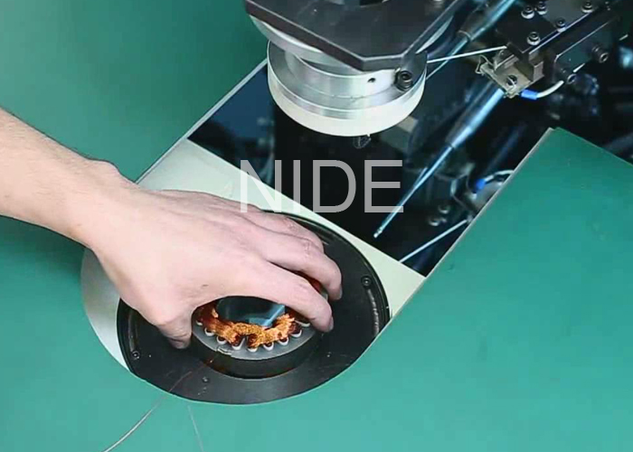 Loading stator vertically; equipped with pressing, automatic feeding, automatic cutting device, etc.; overhang winding adopts twin needle lacing by servo system simultaneously; needle indexing, hooking and stator indexing are controlled by servo system; spindle adopts frequency speed control; slot by slot lacing, interval lacing, and fancy lacing could be achieved by setting in human-machine interface; characterized by compact appearance, fast speed .low noise; simple operation and easy tooling change.